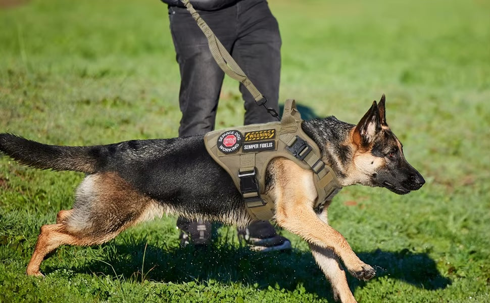 Built with durable 1050D nylon, adjustable straps, and heavy-duty metal buckles, this harness ensures unmatched strength, comfort, and security. Perfect for medium-to-large breeds, its MOLLE system adds versatility for training, adventures, and everyday use.